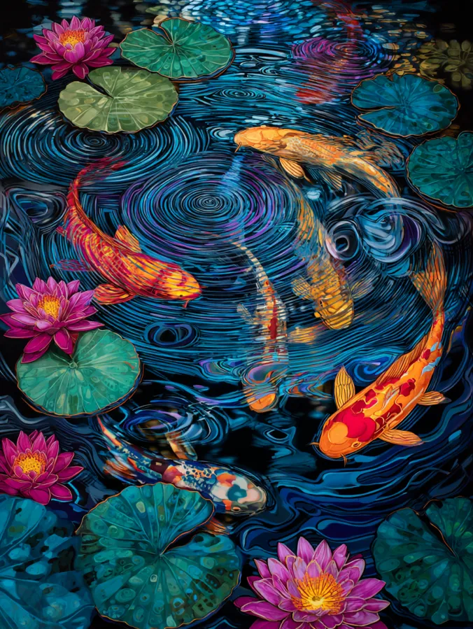 Painting a koi pond like this feels surprisingly calming. I love playing with the circular ripple patterns because they almost feel like a painting meditation. The fish are fun to paint since each one can have its own colors and markings. Nothing has to look identical which makes the process feel relaxed and creative. When I work on a scene like this I usually get lost in the flow of brush strokes and color blending. The finished painting always feels peaceful yet lively at the same time.