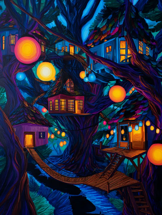 This acrylic painting shows a magical treehouse village tucked high within twisting forest trees. Several cozy houses sit on wooden platforms connected by winding bridges and ladders. Warm golden light glows from the windows and round lanterns that hang between branches. The surrounding forest is painted in deep blues, purples, and teal tones which makes the glowing lights shine even brighter. Curved tree trunks frame the scene while a small river flows below through the forest floor. Thick expressive brush strokes give texture to the bark, rooftops, and glowing sky which makes the whole scene feel lively and dreamy.
