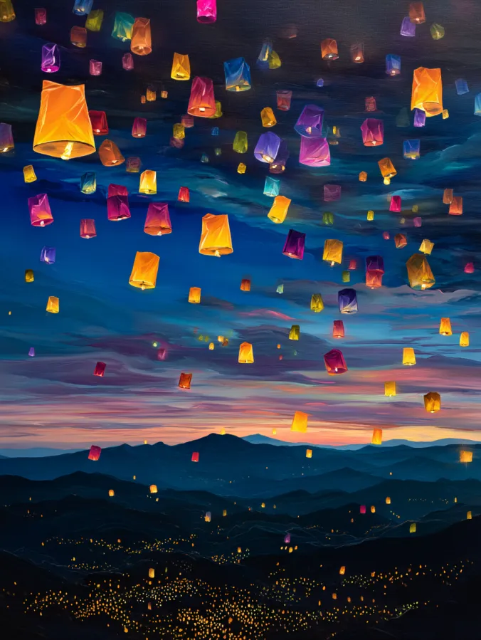 This acrylic painting captures a magical evening sky filled with hundreds of glowing lanterns drifting upward. Each lantern shines in warm shades of gold, coral, pink, and violet against a deep blue twilight sky. Soft layered clouds stretch across the horizon while distant mountain silhouettes roll gently in the background. Below the mountains tiny golden lights sparkle from a quiet town in the valley. The lanterns scatter across the entire canvas which creates beautiful movement and depth. Smooth blended brush strokes shape the sky while brighter strokes highlight the glowing lantern light.