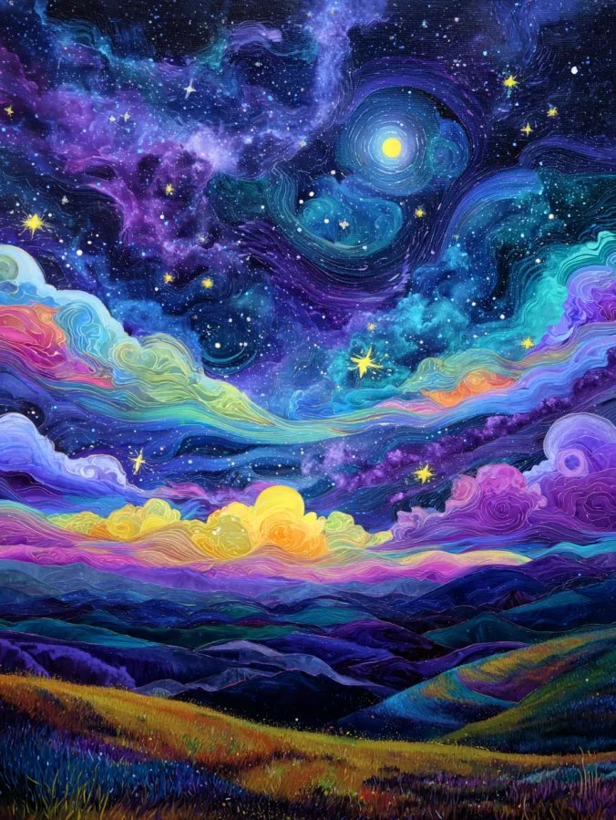 This acrylic painting shows a dreamy night sky swirling with color and movement above a peaceful landscape. The sky is filled with deep blues, purples, and teal tones that blend into soft rainbow streaks flowing across the stars. Bright golden stars sparkle throughout the scene while a glowing moon sits inside a spiral of cosmic clouds. Below the sky gentle hills roll across the canvas in darker shades of green and blue. The clouds near the horizon glow in pastel pink, yellow, and lavender which adds warmth to the scene. The brush strokes are loose and flowing which gives the whole sky a magical swirling motion.
