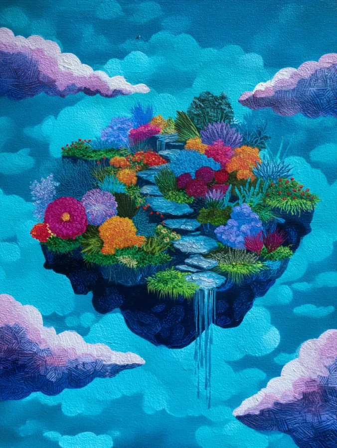 This acrylic painting shows a magical floating island drifting among soft blue clouds. The island is covered with bright flowers, textured greenery, and playful bursts of color in pink, coral, yellow, and violet. A winding stone path climbs gently through the garden and leads toward the top of the island. Small waterfalls spill down the rocky edges and disappear into the sky below. Puffy lavender clouds surround the island which makes it feel light and dreamy. Thick brush strokes build rich texture across the flowers, leaves, and stone path which gives the whole painting a lively storybook look.