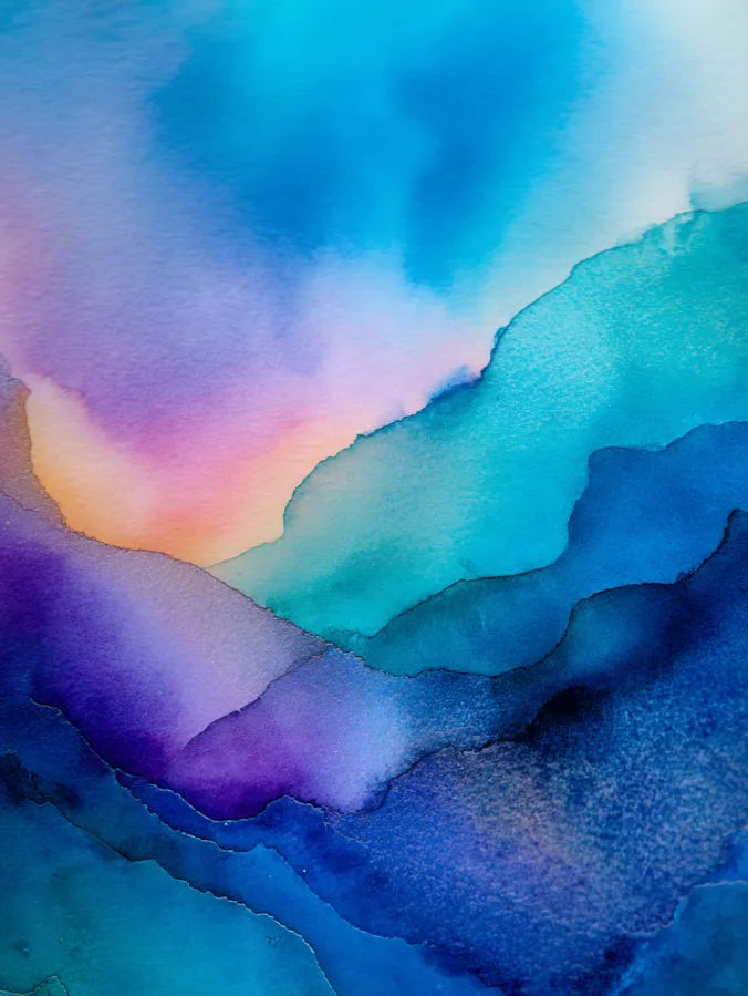 This watercolor design flows through layered pools of turquoise, teal, violet, and soft peach, blending into one another with gentle transitions and organic edges. The composition feels abstract and landscape inspired, with darker blue shapes anchoring the lower area and lighter washes glowing toward the center. Brush strokes are loose and fluid, allowing natural blooms and soft gradients to form, while the overall layout feels balanced without being rigid or overworked.
