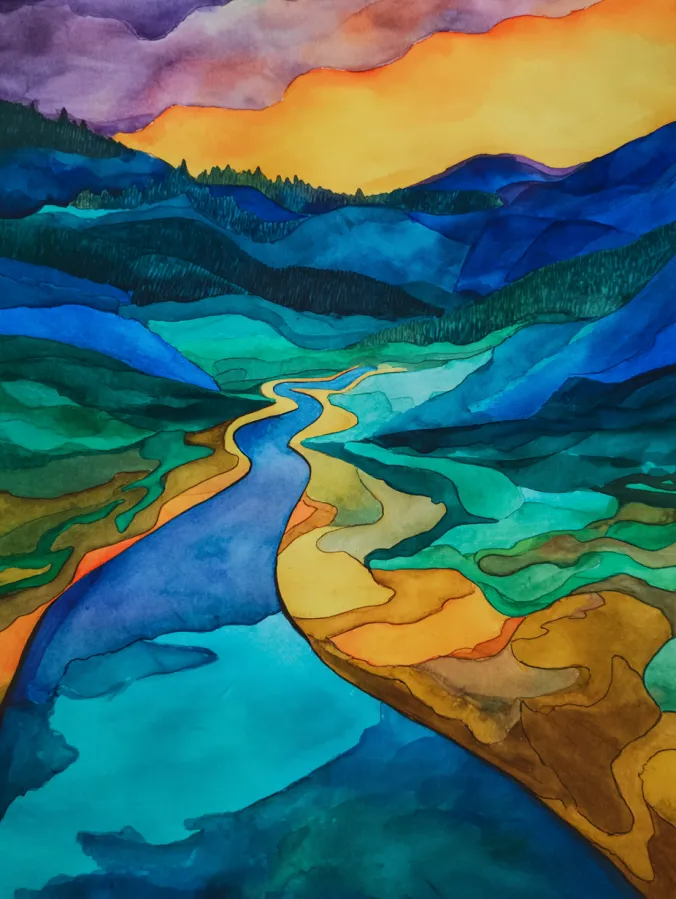 This watercolor design features a winding river cutting through layered hills in rich blues, greens, and warm golden tones. Each section of the landscape is built with flat yet expressive washes that gently overlap, creating clear separation without harsh edges. The river acts as a natural guiding line, pulling the eye from the foreground into the distance, while the sky glows with warm yellows and soft purples that balance the cooler colors below. The overall layout feels bold and graphic but still soft enough to keep that classic watercolor charm.