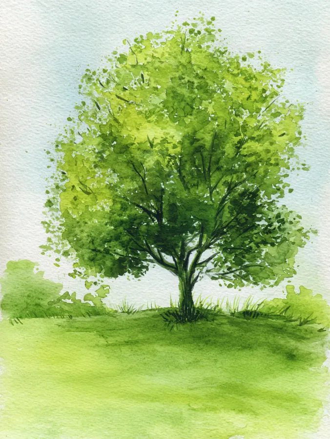 This watercolor design features a single tree standing in a soft green landscape, painted with loose, layered washes that suggest leaves rather than defining each one. The foliage is built from varied shades of fresh green, with darker tones near the center and lighter touches around the edges to create volume. The trunk and branches are simple and understated, allowing the leafy canopy to remain the focal point. The background stays light and open, giving the whole scene an airy and peaceful feel.