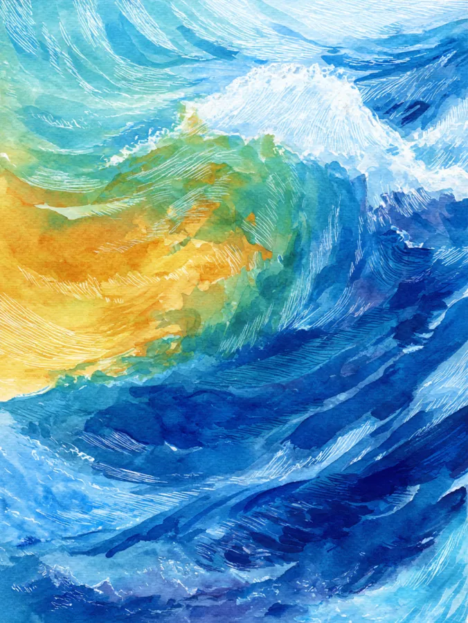 This watercolor design captures rolling ocean waves through bold, sweeping strokes and layered washes of blue, teal, and touches of warm golden yellow. The paint moves in energetic curves, with visible brush marks and textured lines that suggest motion and foam without strict detail. Darker blues anchor the deeper water while lighter highlights skim across the surface, giving the composition a lively sense of depth and rhythm. The overall layout feels fluid and powerful, yet still loose enough to celebrate watercolor’s natural flow.