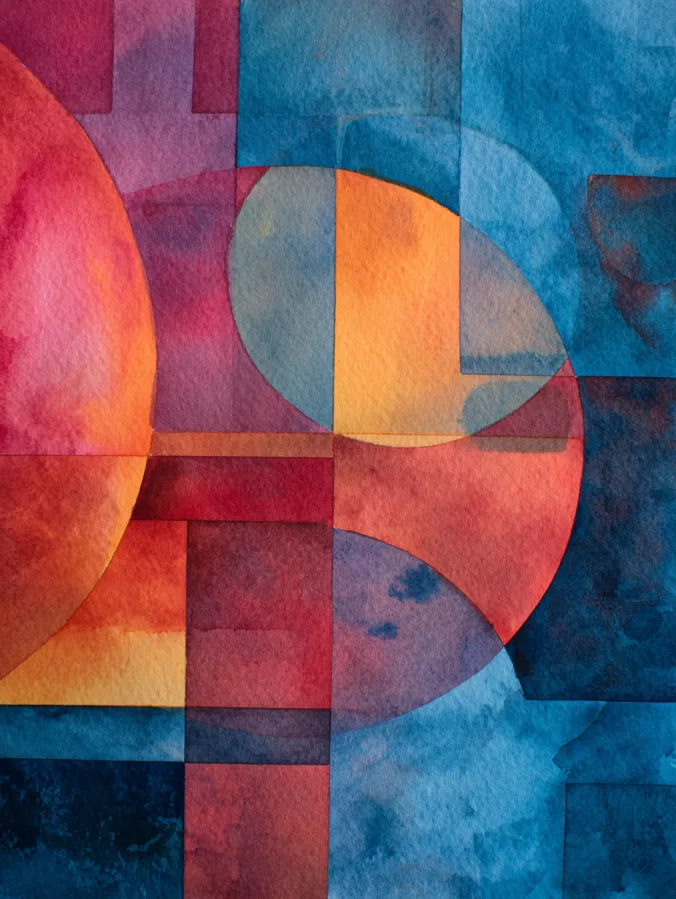 This watercolor design plays with overlapping circles and rectangular shapes layered in rich blues, warm reds, and glowing orange tones. The edges are soft and slightly uneven, letting the watercolor texture shine through while keeping the geometry relaxed and organic. Transparent layers overlap to create new color blends, and the composition feels balanced without being perfectly symmetrical. The background washes stay moody and textured, giving the shapes a strong sense of depth and visual interest.