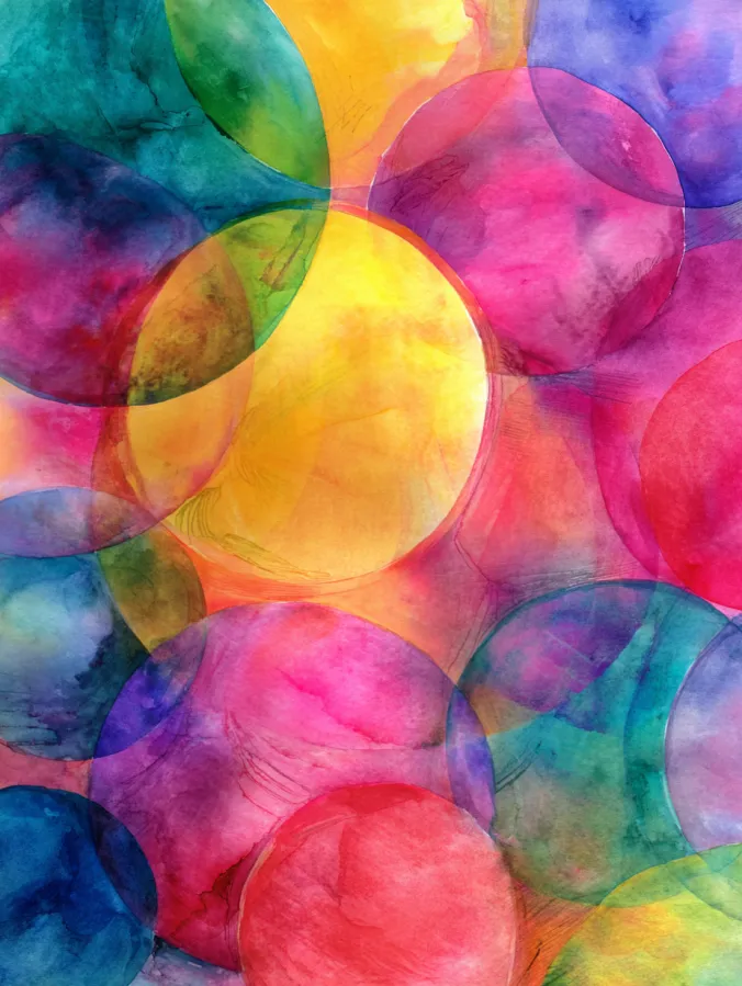 This watercolor design features a lively arrangement of overlapping circular shapes painted in bright yellows, pinks, reds, blues, and greens. Each circle is built with soft washes that stay slightly translucent, allowing colors to blend and shift where they overlap. The edges are loose and organic, with visible paper texture adding warmth and movement. The overall composition feels playful and balanced, with the glowing yellow center pulling everything together while the surrounding colors gently flow around it.