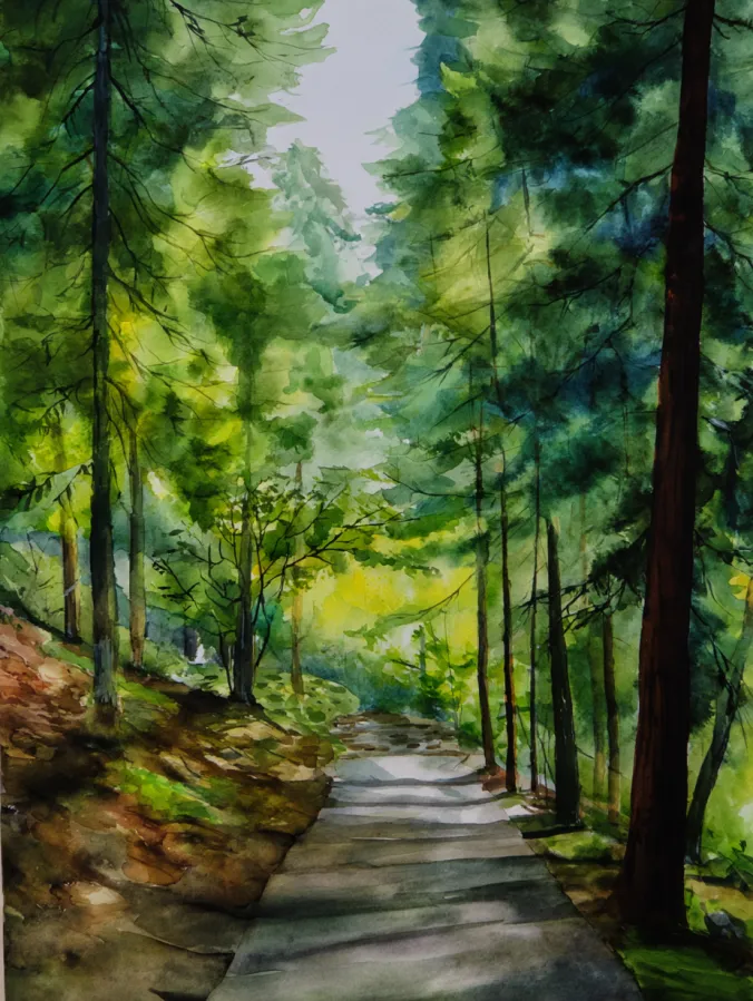 This watercolor design shows a winding forest path framed by tall trees and layered greenery in soft greens, deep shadows, and warm sunlit patches. The brushwork stays loose and expressive, with foliage suggested through broken washes and gentle color shifts rather than sharp detail. Light filters through the canopy, creating contrast between bright areas and cooler shadows on the path. The composition naturally guides the eye forward, making the scene feel inviting and calm.