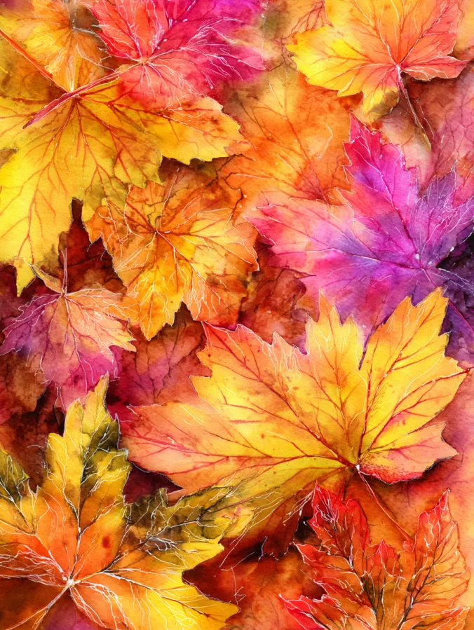 This watercolor design is filled with overlapping autumn leaves painted in warm shades of golden yellow, burnt orange, coral, and soft red. Each leaf has gentle value shifts and visible vein details that add texture without feeling heavy or stiff. The washes blend naturally where the leaves overlap, creating depth and richness while keeping the edges soft and organic. The overall layout feels full and cozy, with colors layered closely together to create that scattered fall leaves look.