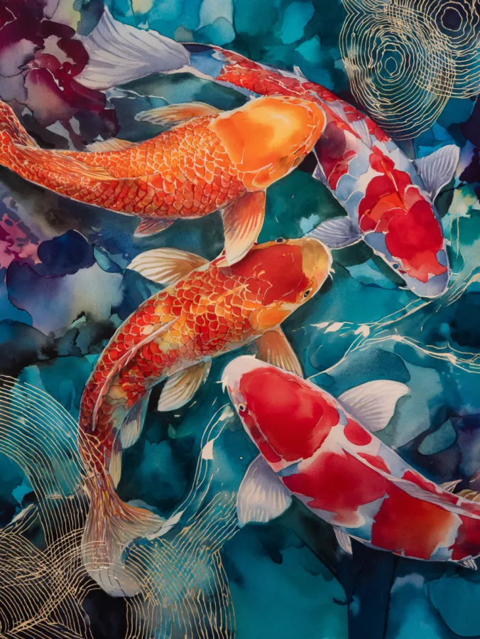 This watercolor design features vibrant koi fish gliding through deep teal and blue water, painted with rich layers of orange, red, white, and soft gold accents. The fish curves create natural movement, while delicate line details suggest scales and fins without overpowering the fluid washes. The background blends abstract water shapes with subtle texture, allowing the koi to stand out while still feeling fully immersed in their environment. The overall composition feels dynamic yet balanced, with color contrasts that keep the eye moving across the page.