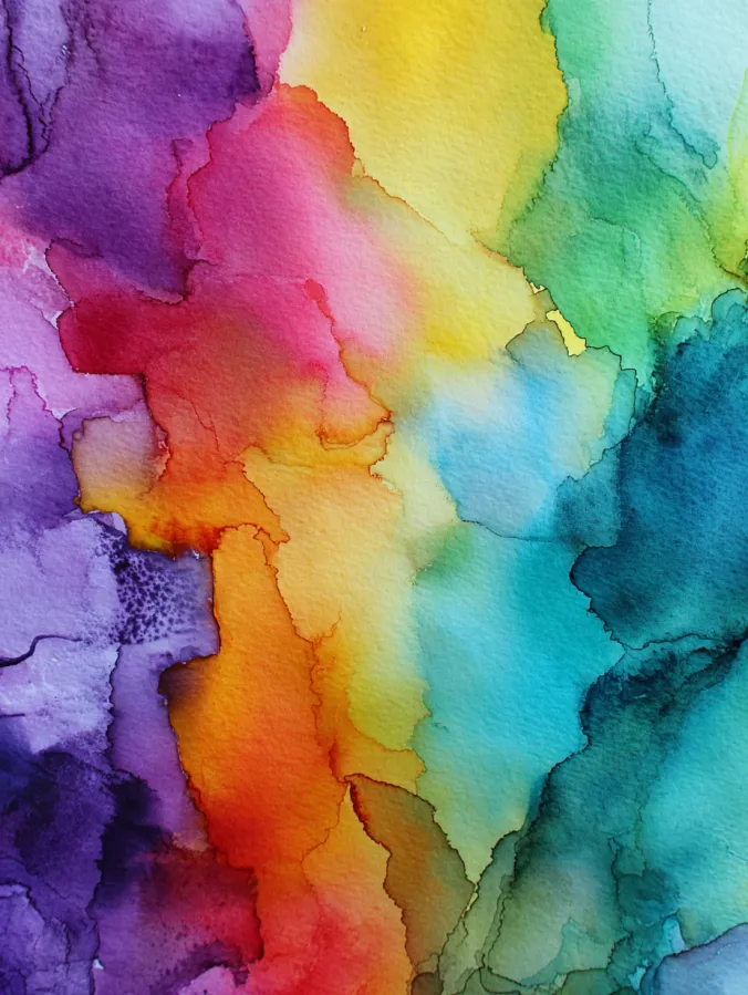 This watercolor design is all about rich color movement, with bold washes of purple, coral, yellow, teal, and green flowing into one another across the page. The edges stay soft and irregular, creating natural shapes where pigments meet and separate. Subtle blooms and textured areas add interest without any defined subject, allowing the composition to feel expressive and open. The layout feels balanced through color distribution rather than structure, making the whole piece feel lively and spontaneous.