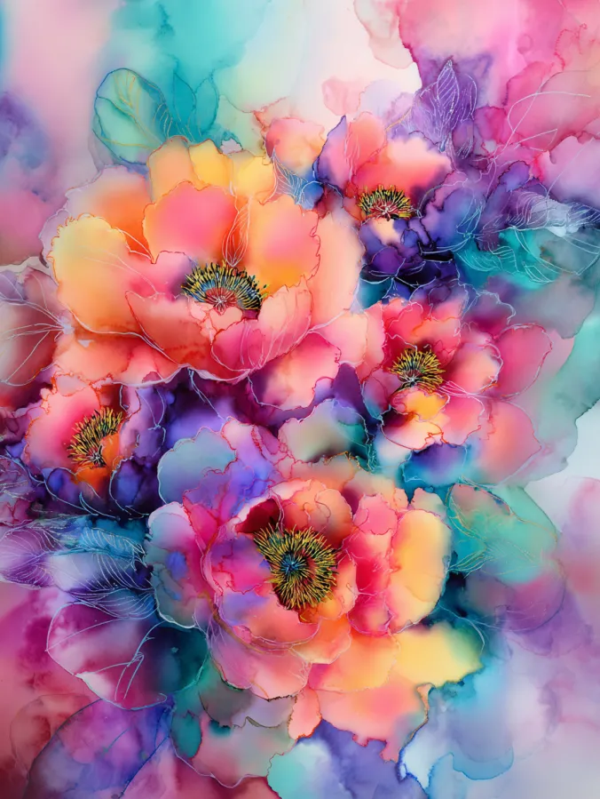 This watercolor design bursts with layered florals in glowing shades of coral pink, peach, violet, and teal, all softly melting into one another. The petals feel airy and fluid, with translucent washes building depth while still keeping that loose watercolor charm. Fine line details gently define the flower centers and edges, adding structure without overpowering the softness. The composition feels full and lush, with blooms overlapping naturally and an abstract background that keeps the whole piece feeling light and dreamy.