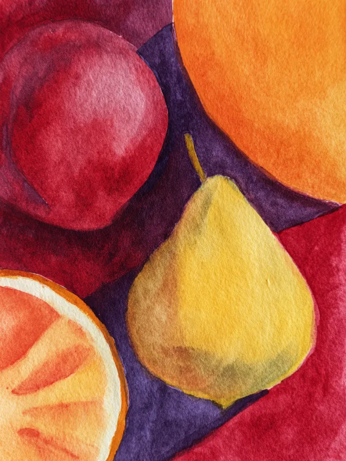This watercolor design features a cozy arrangement of fruit shapes painted in warm reds, oranges, yellows, and deep purples. Each fruit is built with smooth washes and gentle value changes that give them a rounded, soft appearance. The edges stay slightly loose, allowing the watercolor texture to shine through, while the background colors create contrast without overpowering the main shapes. The overall composition feels balanced and inviting, with overlapping forms that add depth without complexity.
