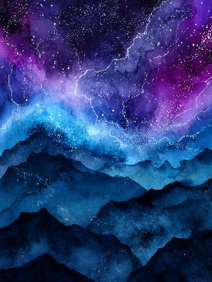 This watercolor design captures a dramatic night sky filled with deep blues, purples, and hints of turquoise, layered above dark mountain silhouettes. Soft washes blend seamlessly across the sky, while splattered white details suggest stars scattered through the darkness. Lighter streaks and glowing areas add a sense of movement and depth, making the sky feel expansive and alive. The mountains below stay simple and shadowed, grounding the composition and letting the sky take center stage.