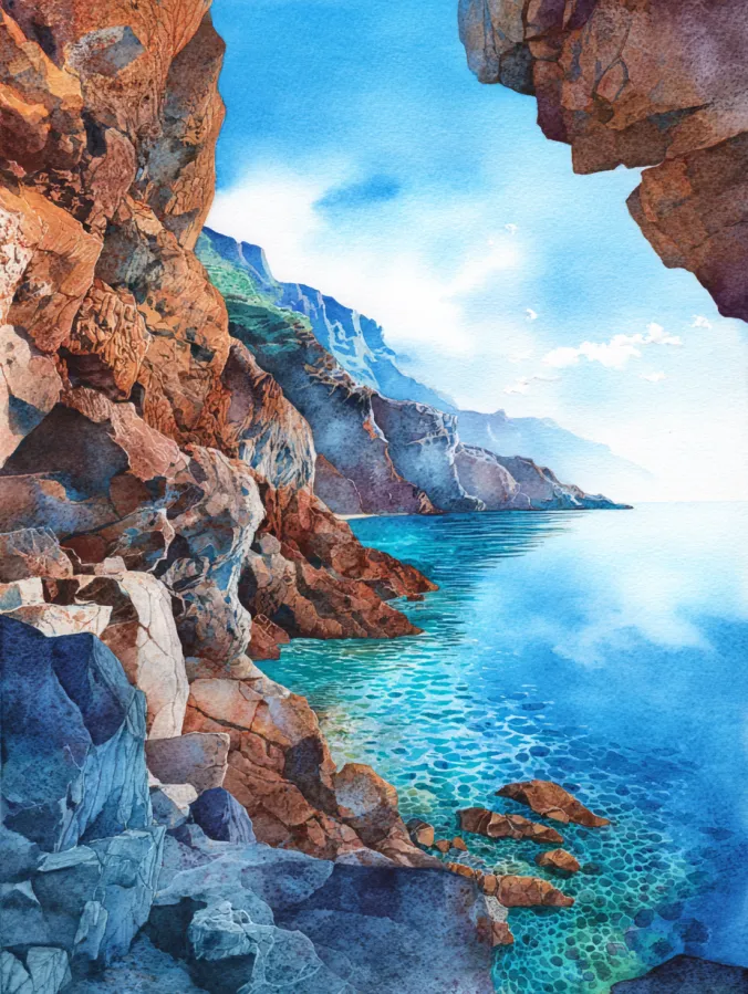 This watercolor design captures a dramatic coastal scene where rugged cliffs meet clear turquoise water. Warm browns and cool blues balance beautifully, with layered washes creating textured rock surfaces and transparent water near the shore. The composition uses natural framing from the cliffs to guide the eye toward the distant horizon, giving the scene depth without feeling overwhelming. Brush strokes shift between loose washes and slightly more defined edges, keeping the overall look expressive and inviting.