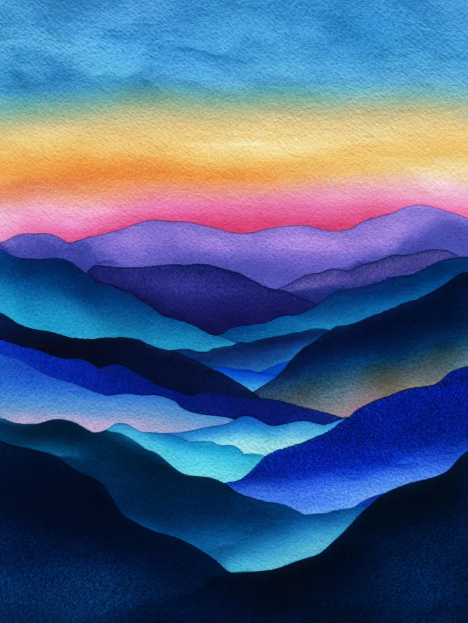 This watercolor design shows gently stacked mountain shapes flowing into the distance, painted in rich blues, teals, and purples beneath a glowing sky of yellow, peach, and soft pink. Each ridge is created with smooth, even washes and softened edges, allowing the layers to overlap without harsh lines. The composition feels calm and balanced, with lighter tones pulling the eye toward the center and darker foreground shapes adding depth and grounding.