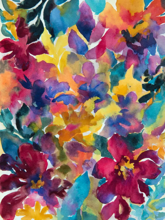 This watercolor design bursts with abstract floral forms layered in bold pinks, sunny yellows, deep blues, teal, and soft purples. The petals are suggested through loose, expressive brush strokes rather than defined outlines, allowing colors to overlap and blend naturally. White spaces peek through the composition, giving the painting breathing room and keeping it lively instead of crowded. The overall layout feels playful and spontaneous, with flowers scattered organically across the page in a joyful mix of color and movement.