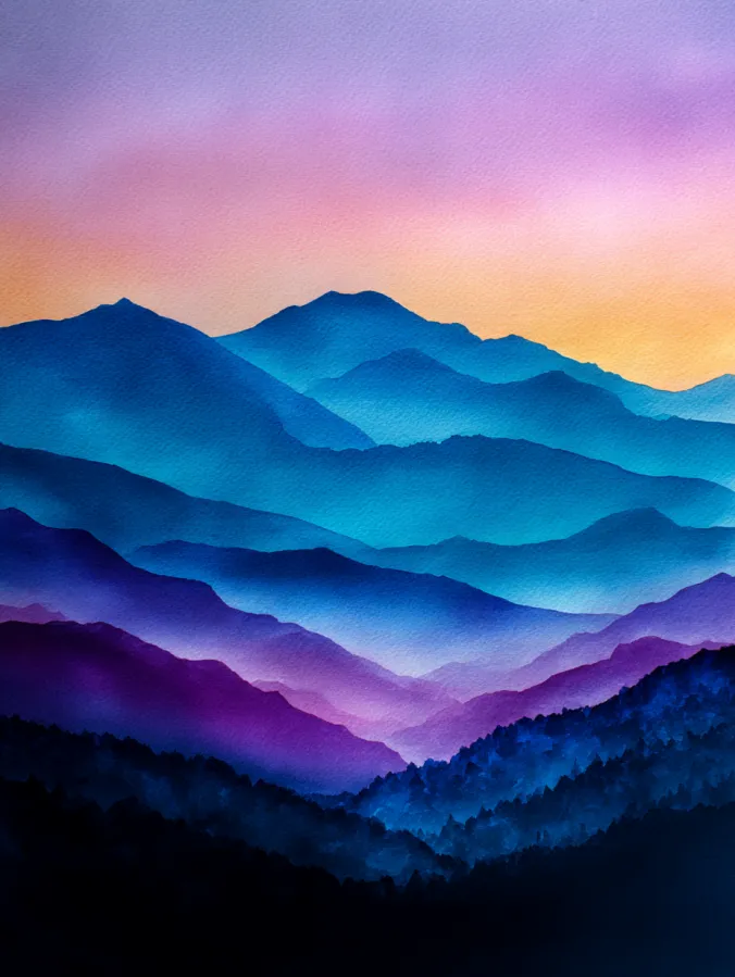 This watercolor design shows a series of softly layered mountain shapes fading into the distance, built with smooth washes of deep blue, teal, and violet. Each ridge gently overlaps the next, creating a calm sense of depth without sharp lines or heavy detail. The sky transitions from warm peach to soft lavender, adding contrast while keeping the overall mood peaceful and balanced. The brushwork feels controlled but relaxed, with subtle texture from the paper showing through the washes.