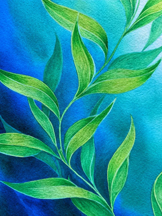 This watercolor design features graceful green leaves stretching upward across a rich blue background, with each stem and leaf formed through smooth, confident strokes. The greens shift gently from light to deep tones, giving the foliage a fresh layered look without feeling heavy. The background wash blends softly from teal to deeper blue, creating contrast while keeping everything calm and cohesive. The overall layout feels airy and balanced, with plenty of movement and space for the eye to wander.