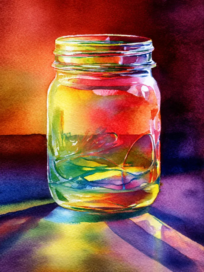 This watercolor design features a glowing glass jar filled with layered washes of warm reds, golden yellows, greens, and cool blues, all softly overlapping inside the transparent form. The jar edges are defined with loose yet confident strokes, allowing highlights and reflections to feel natural rather than rigid. Light spills outward onto the surface below, creating colorful shadows that echo the tones inside the jar. The background fades smoothly from deep warm hues into darker purples, giving the whole composition a rich sense of depth and atmosphere.