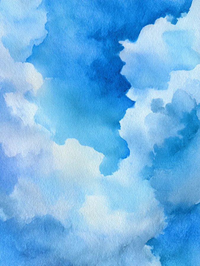 This watercolor design features gentle cloud like shapes formed through layered blue washes that ebb and flow across the page. The colors range from pale sky blue to deeper cobalt, blending softly with feathered edges and natural blooms. The composition feels open and airy, with negative space allowing lighter areas to glow through. Brush strokes are loose and relaxed, letting water spread naturally and create organic transitions that feel calm and unforced.