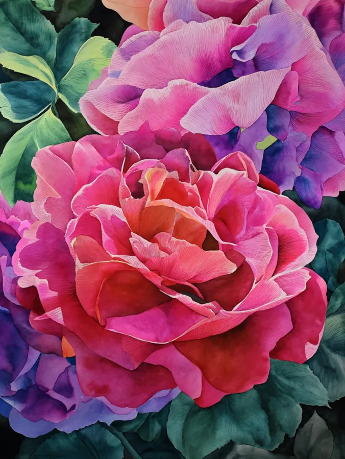 This watercolor design showcases large blooming flowers built from rich layers of pink, coral, violet, and deep green. Each petal is softly shaped with gradual color shifts that create depth without harsh lines. Subtle vein details add structure while still keeping the watercolor look loose and organic. The composition feels full and luxurious, with overlapping blooms and foliage creating a sense of movement and natural flow across the page.