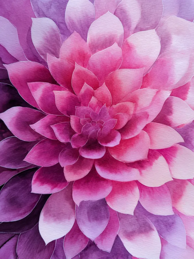 This watercolor design centers around a layered flower built from soft petal shapes that radiate outward in a calm, balanced pattern. Shades of pink, rose, and muted violet blend smoothly from darker tones near the center to lighter edges, creating depth without harsh contrast. The brushwork feels controlled yet soft, with each petal slightly overlapping the next to form a soothing, almost mandala like layout. The background stays subtle and blended, allowing the flower to remain the clear focal point.