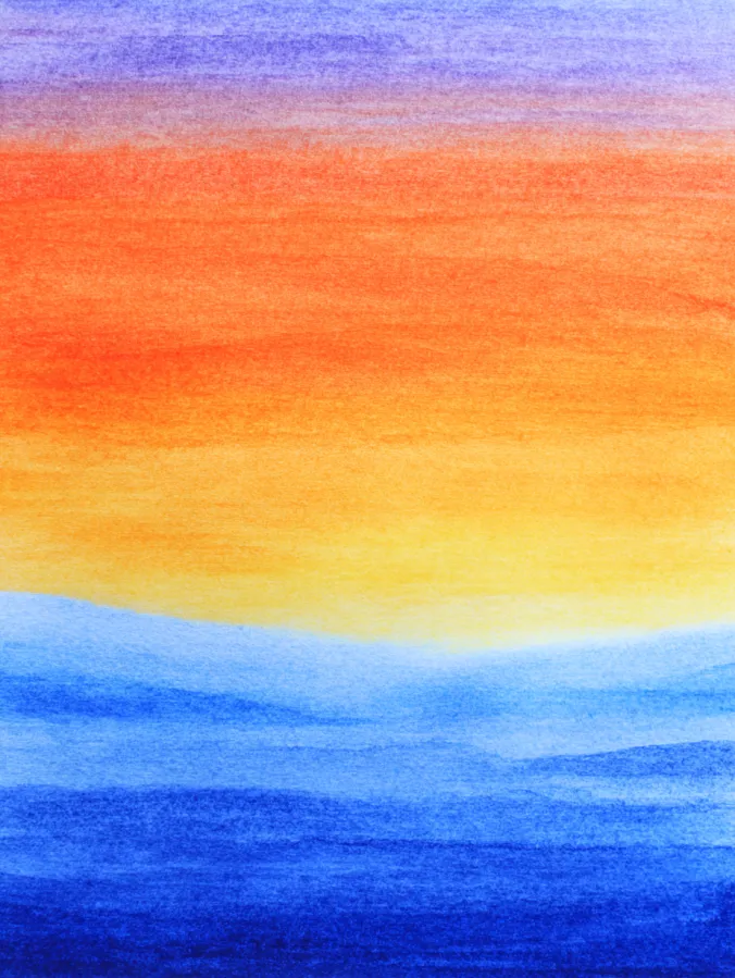 This watercolor design features a calm horizontal gradient that flows from warm golden yellow into soft orange and then into cool blues below. The transitions feel smooth and even, with visible paper texture giving the washes a gentle grain. The lower section suggests water through deeper layered blues, while the upper area reads as a glowing sky without sharp lines or defined shapes. The composition is simple and balanced, letting color blending and value shifts do all the visual work.