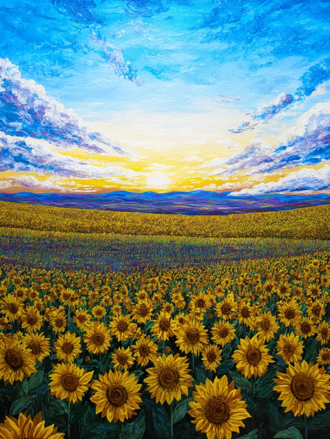 This acrylic painting captures a breathtaking field of sunflowers stretching as far as the eye can see beneath a glowing sunrise sky. The foreground is packed with bright golden blooms, each sunflower painted with rich layered petals and deep brown centers that add beautiful contrast. Thick textured brush strokes bring the flowers to life, while the distant rows gradually soften into colorful bands of yellow and green. Above the field, a dramatic sky bursts with vibrant blues, soft whites, and warm hints of yellow near the horizon. The clouds sweep across the canvas in expressive strokes, creating movement and guiding your eyes toward the glowing morning light in the distance.
