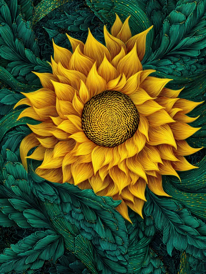 This acrylic painting features a stunning close up sunflower surrounded by lush layered leaves. The flower sits proudly in the center with glowing golden petals that curve outward in graceful pointed shapes. Each petal is painted with delicate lines and subtle shading that give the flower a silky textured look. The center of the sunflower forms a mesmerizing spiral pattern of tiny golden seeds. Around the bloom, deep emerald green leaves fill the background with rich overlapping shapes and fine brush textures that create a beautiful sense of depth and movement.