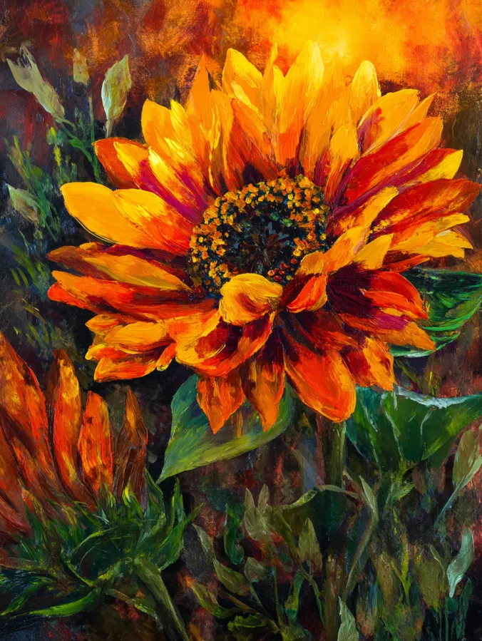 This acrylic painting centers on a single dramatic sunflower bursting with warm color. The petals glow with layers of golden yellow, deep orange, and hints of crimson that create a fiery effect around the bloom. Thick expressive brush strokes give the petals a lively texture that almost looks like they are catching sunlight. The center of the flower is rich and detailed with speckled tones of dark brown, gold, and green. Around the bloom, loose leafy shapes and soft earthy colors blend into the background which makes the sunflower feel bold and radiant in the middle of the canvas.
