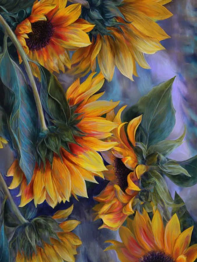 This acrylic painting shows several sunflowers gently leaning across the canvas in a graceful flowing arrangement. The petals glow with warm yellow and orange tones that fade softly toward their edges. Each flower tilts in a slightly different direction which gives the composition a natural relaxed movement. Long green stems and wide leaves weave through the flowers with soft curved brush strokes. Behind them, the background blends cool shades of lavender, blue, and misty gray which makes the warm petals stand out beautifully against the soft atmosphere.