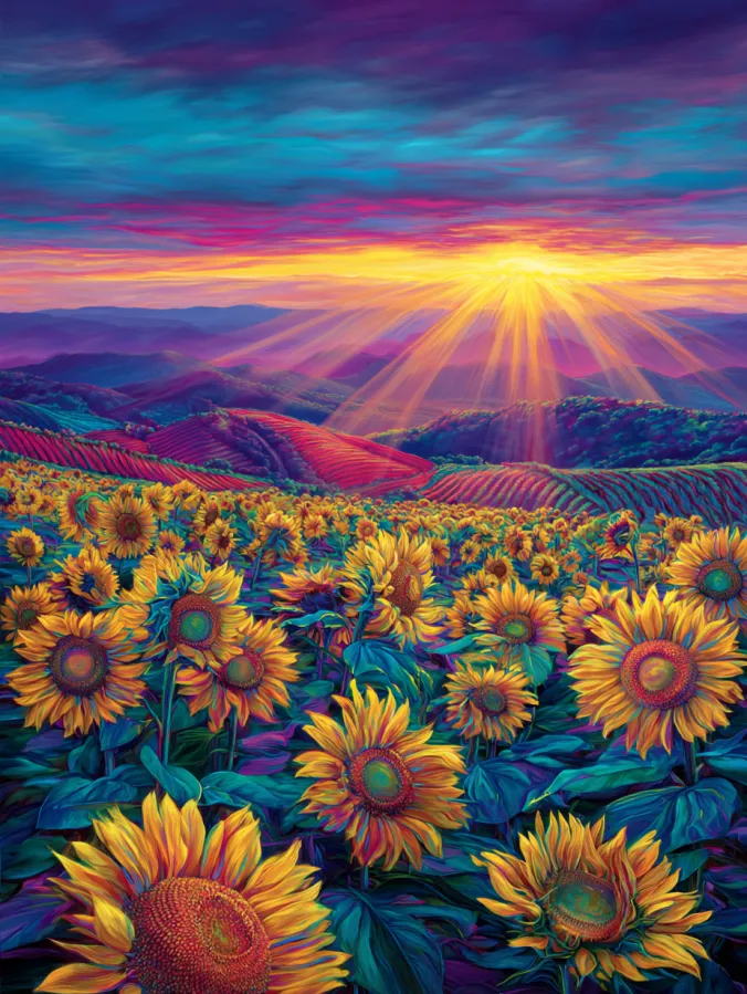 This acrylic painting shows a sweeping field of sunflowers stretching across rolling hills under a brilliant sunset sky. The foreground is filled with glowing golden blooms, each one painted with warm yellows and touches of orange that catch the fading sunlight. Rich green leaves and deep shadows create contrast that helps the flowers stand out across the landscape. Beyond the field, colorful hills ripple toward the horizon in shades of purple, teal, and rose. The sky above explodes with dramatic color as bright sun rays burst through glowing clouds of pink, violet, and amber.