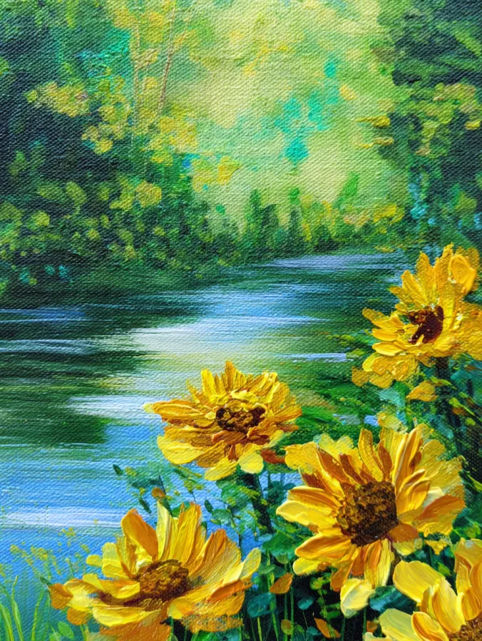 This acrylic painting captures a tranquil riverside scene where bright sunflowers bloom along the water’s edge. The flowers fill the foreground with glowing yellow petals and warm golden tones that stand out against the lush greens around them. Their centers are rich and textured while thick leaves and stems create lively layers of foliage. Behind the flowers, the calm river stretches gently through the landscape with soft reflections shimmering across its surface. The distant trees and forest blend into dreamy shades of green which create a peaceful natural backdrop for the cheerful blooms.