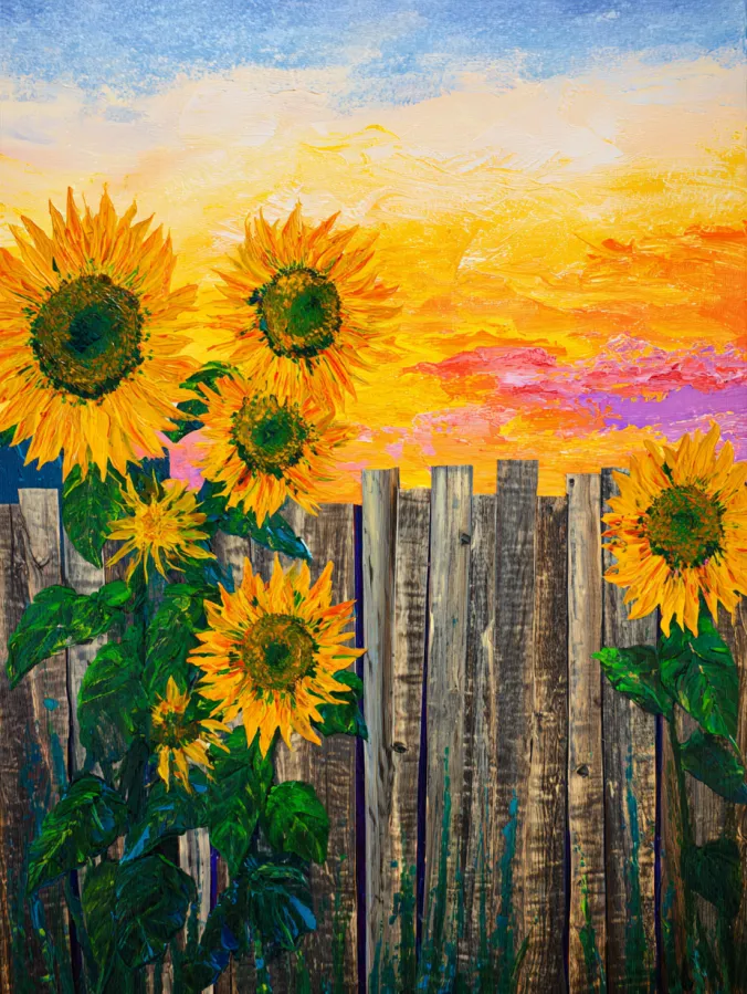 This acrylic painting shows a cheerful row of tall sunflowers blooming beside a weathered wooden fence. The flowers stretch upward with bright golden petals and deep green centers that glow against the warm sky behind them. Their sturdy stems and large leaves climb along the fence boards which are painted with textured strokes of brown, gray, and hints of blue. Above the fence, the sky shines with layers of golden yellow, peach, and soft pink clouds that feel like the final moments of a summer sunset. The combination of rustic wood and radiant flowers gives the whole scene a cozy countryside charm.