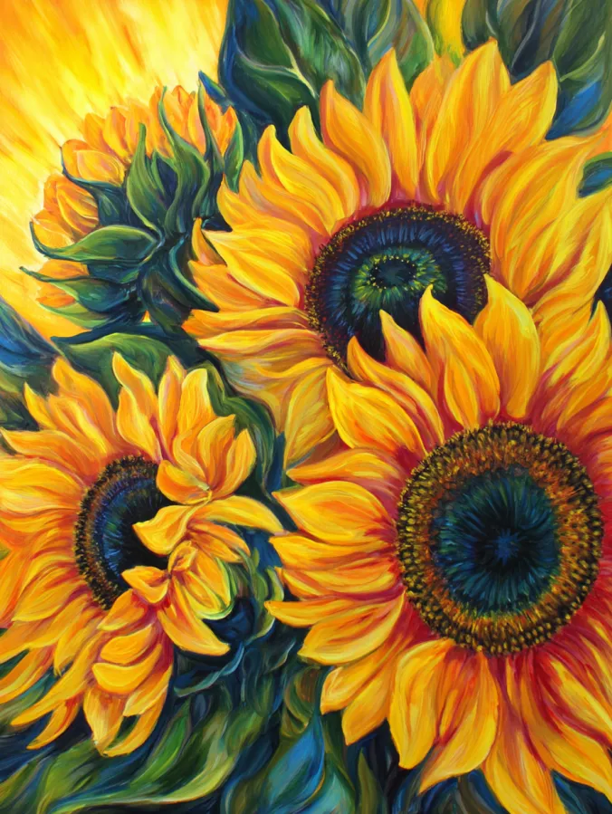 I love how playful this type of painting feels because the colors are so bold and expressive. The sunflowers themselves are simple and recognizable which makes them relaxing to paint again and again. What makes it fun is experimenting with those intense background colors and watching them glow behind the flowers. I always enjoy layering the petals and adding little highlights that make them look warm and sunlit. If you enjoy bright expressive artwork that instantly feels cheerful, this vibrant sunflower composition is a really enjoyable one to paint.