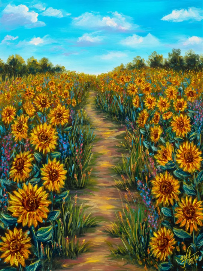 This acrylic painting shows a charming dirt path winding through a wide sunflower meadow under a bright blue sky. Rows of golden sunflowers fill both sides of the path and stretch toward the horizon. Each bloom is painted with warm yellow and orange petals that glow against deep green leaves. The brush strokes are loose and lively which gives the flowers a soft movement as if they are swaying in a summer breeze. Small wildflowers and grasses add pops of pink and purple among the greens. Above the field, fluffy white clouds float across a fresh turquoise sky which balances the warm tones of the flowers below.