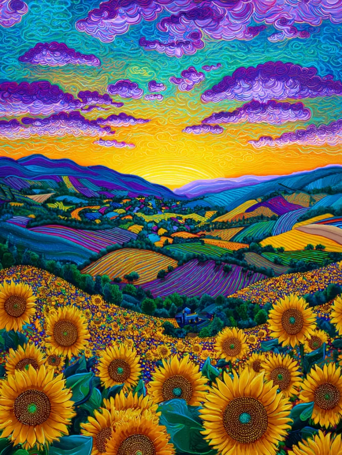 This acrylic painting bursts with color and movement across a dreamy sunflower landscape at sunset. The foreground is filled with large golden sunflowers painted with layered petals and rich textured centers. Behind them, rolling hills unfold in vibrant bands of purple, teal, emerald, and warm golden fields. The farmland patterns create a patchwork effect that guides the eye across the valley. Above it all, the sky glows with an intense sunset of yellow and orange that slowly blends into turquoise and deep blue. Puffy clouds swirl across the sky in playful purple strokes which give the whole scene a magical storybook feeling.