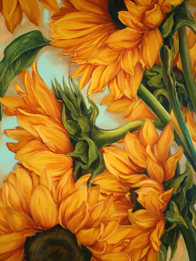 This acrylic painting focuses on a beautiful close up arrangement of sunflowers viewed from different angles. Large golden petals sweep across the canvas in warm shades of yellow and orange with soft highlights that give them a silky texture. The petals overlap and curve naturally which creates a flowing composition that fills the frame with warmth. Thick green stems and leafy shapes weave between the blooms, adding structure and contrast against the soft background. Gentle brush strokes and subtle shading give the flowers depth while the pale sky blue backdrop keeps the whole piece light and fresh.