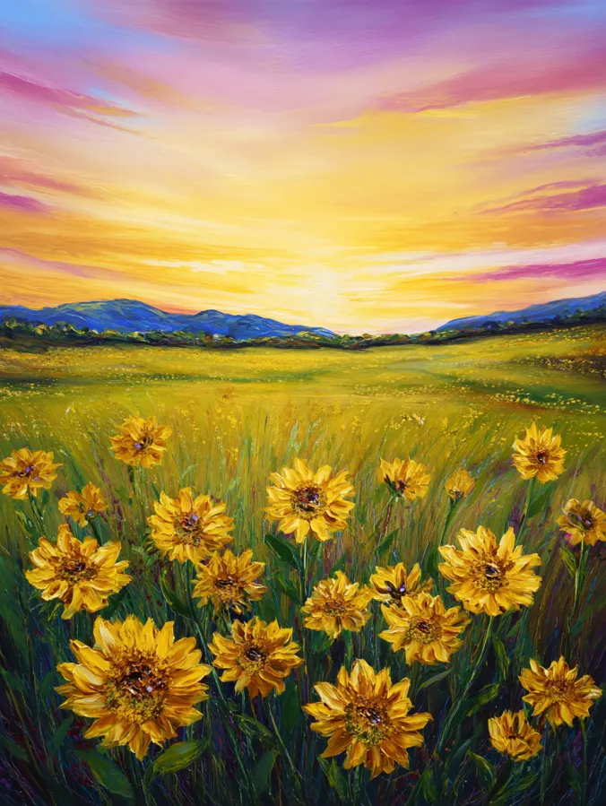 I find this kind of painting so enjoyable because the colors feel playful and a little magical. The mix of soft pastels and bright sunflowers gives you a lot of freedom to experiment with color combinations. Painting those fluffy clouds is especially relaxing since you can let the brush move loosely and blend shades together. The meadow also invites lots of small details like tiny flowers and texture in the grass. If you enjoy cheerful landscapes with a dreamy twist, this sunflower sunset scene is a really fun one to paint.
