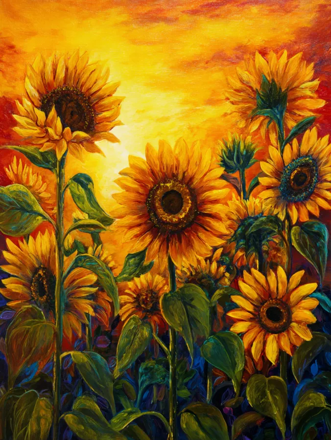 This acrylic painting features a lively cluster of tall sunflowers reaching up toward a glowing sunset sky. The flowers stand proudly with large golden petals that radiate warm yellows and oranges. Their deep brown centers add rich contrast while thick green stems and broad leaves weave together below. The background sky burns with bold shades of orange, amber, and golden light that blend together like a summer evening full of warmth. The brush strokes are expressive and textured which gives the petals and leaves a slightly dramatic movement across the canvas.