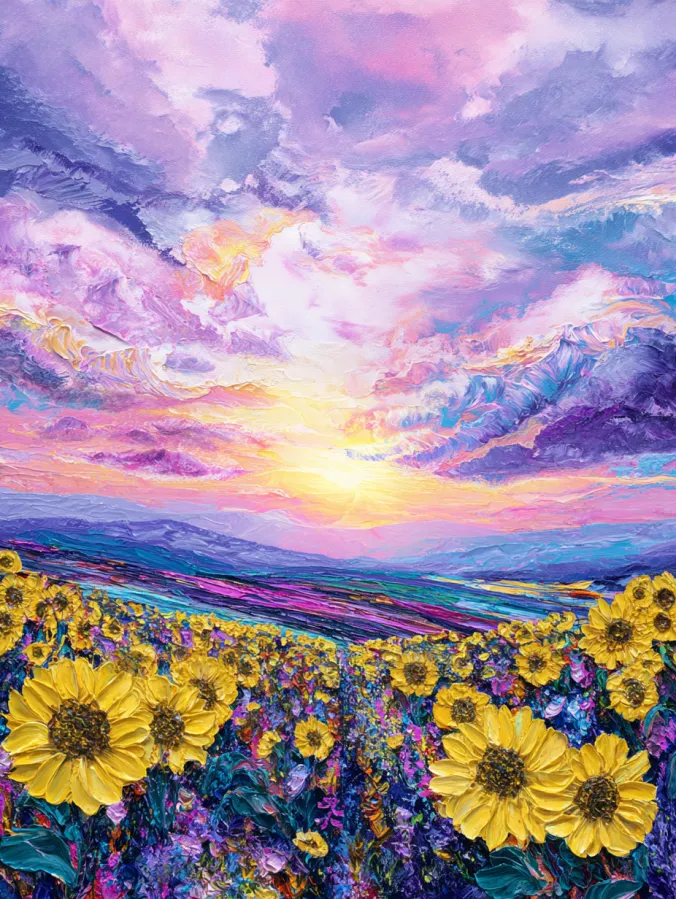 This acrylic painting shows a glowing sunflower field stretching toward a dreamy pastel sunset. Large golden sunflowers bloom across the foreground with rich yellow petals and deep textured centers. Between the flowers, layers of colorful wildflowers create a lively carpet of purples, pinks, and blues that fill the meadow with energy. The landscape rolls gently toward distant hills painted in soft violet and teal tones. Above the field, the sky becomes the true star of the scene. Thick expressive brush strokes form dramatic clouds in shades of lavender, peach, and soft blue while the sun glows brightly near the horizon.