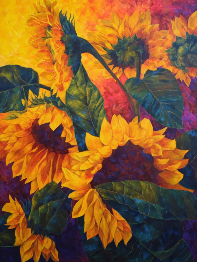This acrylic painting features a bold cluster of sunflowers layered across the canvas with dramatic color behind them. The petals glow in rich golden yellows and warm oranges while deep brown centers anchor each bloom with strong contrast. Large emerald and teal leaves twist and overlap between the flowers which adds movement and depth to the composition. The background bursts with fiery shades of yellow, red, and magenta that blend together like a glowing sunset. The brush strokes feel thick and expressive which gives the flowers a lively energy as if they are gently swaying in warm summer light.