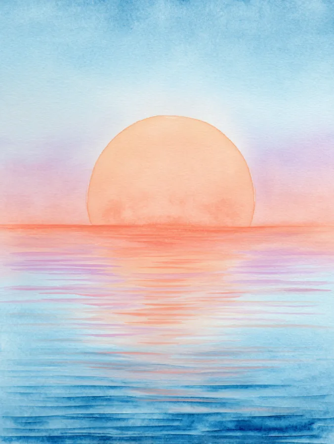 This painting shows a calm sun resting right at the horizon, glowing in soft peach and coral tones while the sky fades gently into airy blues. The water below mirrors those colors with loose horizontal brush strokes that feel light and fluid, creating a smooth reflection without sharp lines. Everything is centered and balanced, with lots of breathing room and gentle watercolor blends that keep the whole piece minimal and soothing.