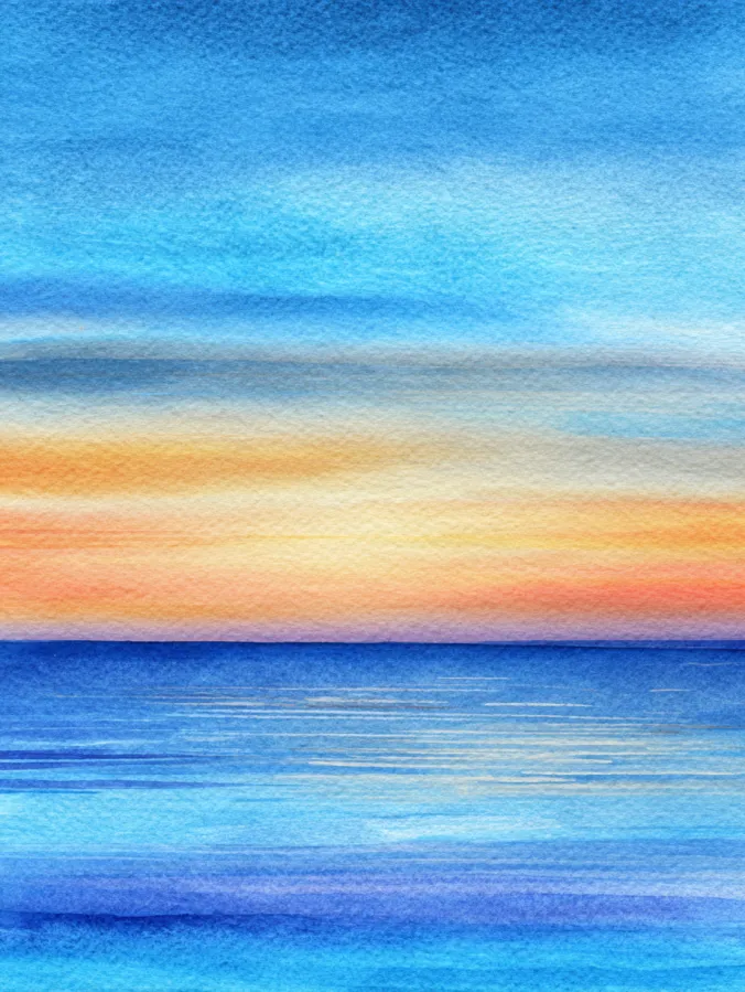 This painting shows a peaceful ocean scene made up of soft horizontal layers that blend from warm sunset tones into cool blues. The sky fades gently from pale gold and peach into light blue, while the water mirrors those colors with subtle ripples and loose brush strokes. Everything feels balanced and open, with smooth transitions and minimal detail that let the watercolor textures shine.