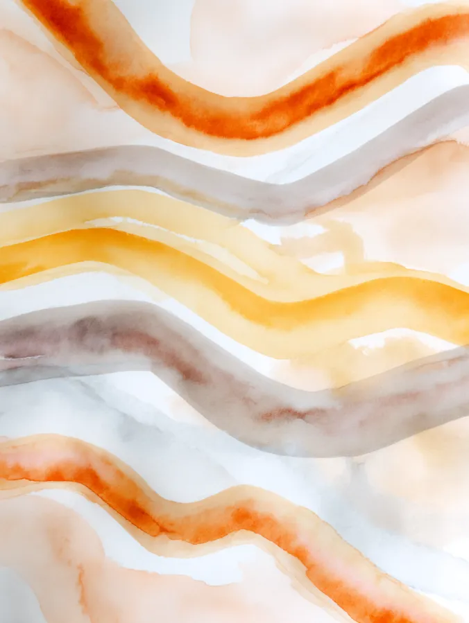 This painting is made up of soft wavy bands that move gently across the page in warm earthy shades like rust golden yellow beige and muted gray. The lines feel organic and relaxed, with watercolor washes that fade and blend naturally into each other. The composition stays simple and open, letting the movement of the curves and the texture of the paper do all the work.