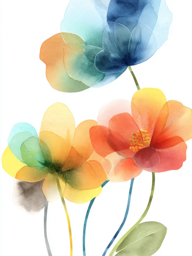 This painting features delicate flowers made from overlapping translucent petals in soft blues greens yellows and warm coral tones. The petals feel light and airy, almost see through, with gentle watercolor layers that blend into each other naturally. Thin flowing stems anchor the composition while the open white space keeps everything feeling fresh minimal and beautifully balanced.