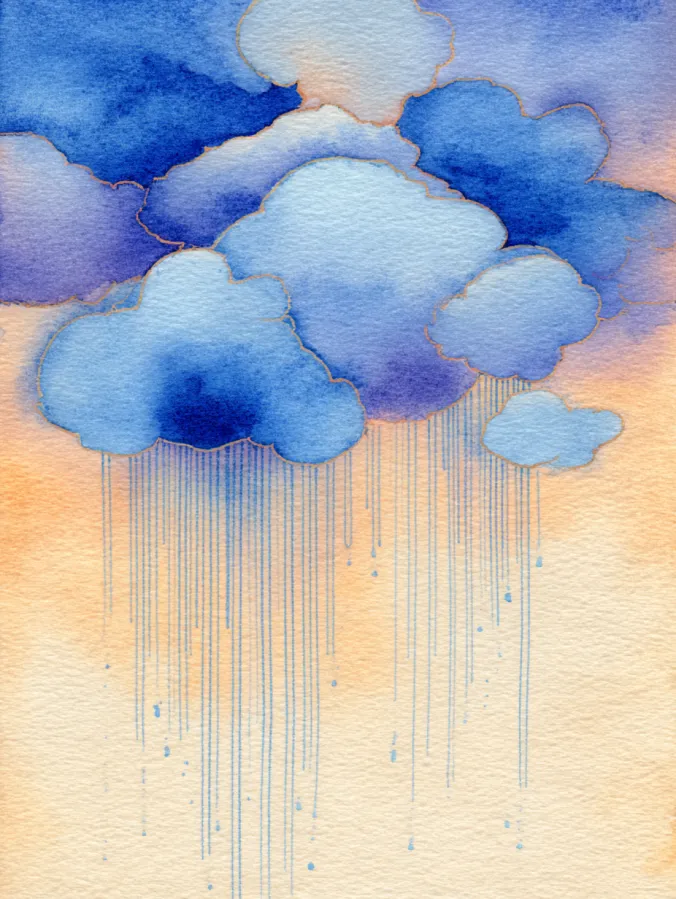 This painting shows a cluster of soft rounded clouds painted in layered blues and muted purples, outlined delicately to keep their shapes clear but still relaxed. Thin vertical rain lines fall gently from the clouds, creating a sense of movement without crowding the page. The background stays warm and light, which makes the cool clouds stand out while keeping the overall look minimal and airy.