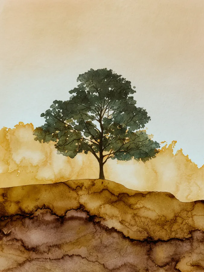 This painting features a single tree standing quietly on a softly layered hill, painted in earthy browns and warm golden tones. The tree itself is detailed just enough, with loose leafy textures and a simple dark trunk that anchors the composition. The background fades gently from warm yellow into pale cream, creating lots of open space that keeps the scene calm, balanced, and minimal.