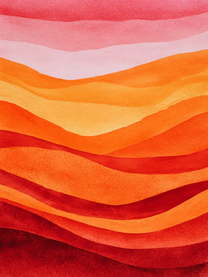 This painting is built from flowing horizontal layers in rich warm tones like coral burnt orange soft peach and deep red. Each band curves gently across the page, with watercolor washes that blend smoothly while still showing texture and depth. The composition feels grounded and rhythmic, using simple repeated shapes and color shifts to create movement without adding extra detail.